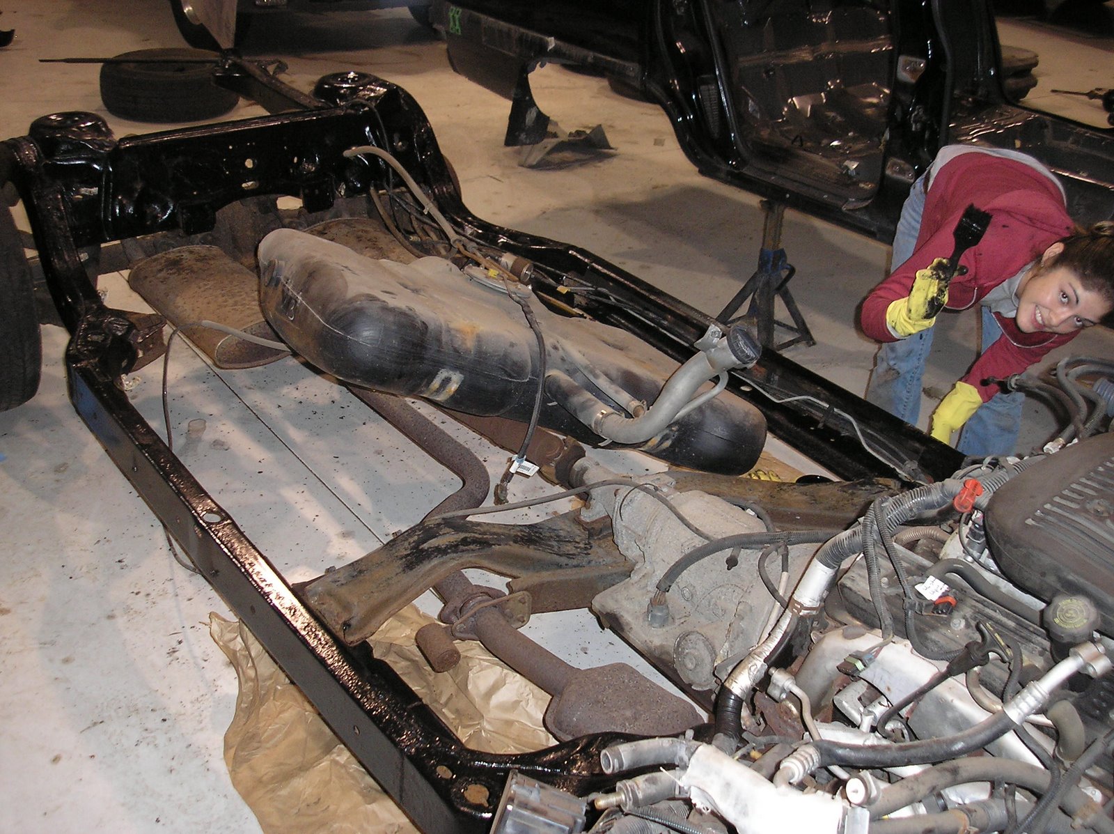 This week we removed the body from the 77. My wife finished painting the chassis black coating over the POR-15. That stuff is great! It paints right over the rust, just as advertised, and looks very good. We have the firewall forward yet to paint on the chassis, and will tackle that as soon as we get the bumper support bent back into shape. The frame was slightly bent in the front of the car, and we have been hammering it back into place.